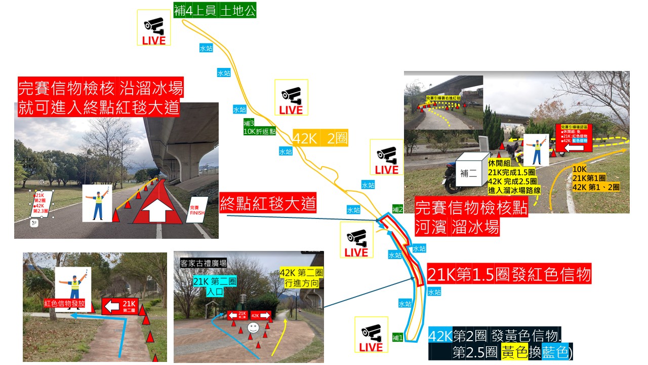 ◆全馬:出發後進入河濱公園右轉過櫻花步道穿過陸橋涵洞後靠右沿步道盜補1左轉到底左轉回到陸橋涵洞右轉切到櫻花步道靠溪邊側回到河濱公園停車場繼續往溜冰場補2,一路靠右側到底後沿河濱路線接到補3有短暫市區道路,依據指引往頭前溪自行車道方向進河濱公園,上到迴紋針自行車道起有短暫上坡,一路會開始與內灣線鐵路與68公路並行跑,到上員土地公廟後折返,沿河濱引導道路回到終點拱門,”請靠左”,全馬完整路線要跑兩圈,第二圈要在補1取黃色信物,第2.5圈要用黃色信物跟工作人員交換藍色信物,所以要進陸橋涵洞時就可以準備把信物拿到手上囉!