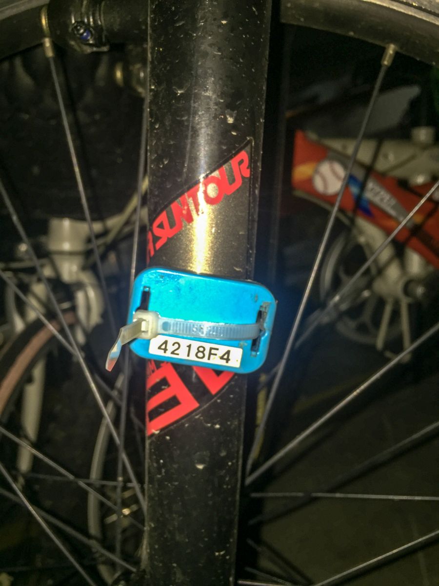 將束帶貼著前叉,由一邊束帶穿過晶片一側耳孔,並由後繞過前叉穿過另一側耳孔